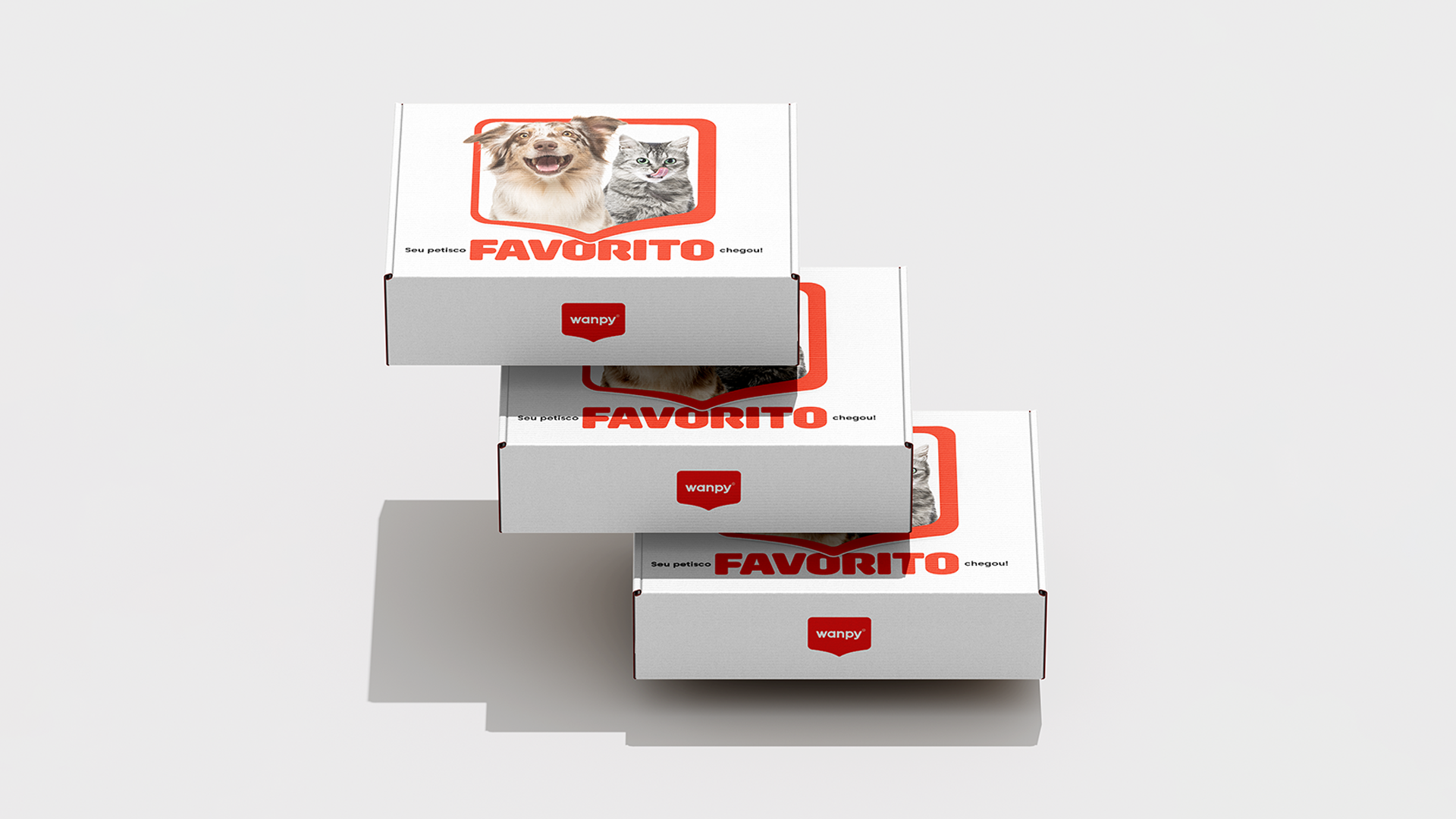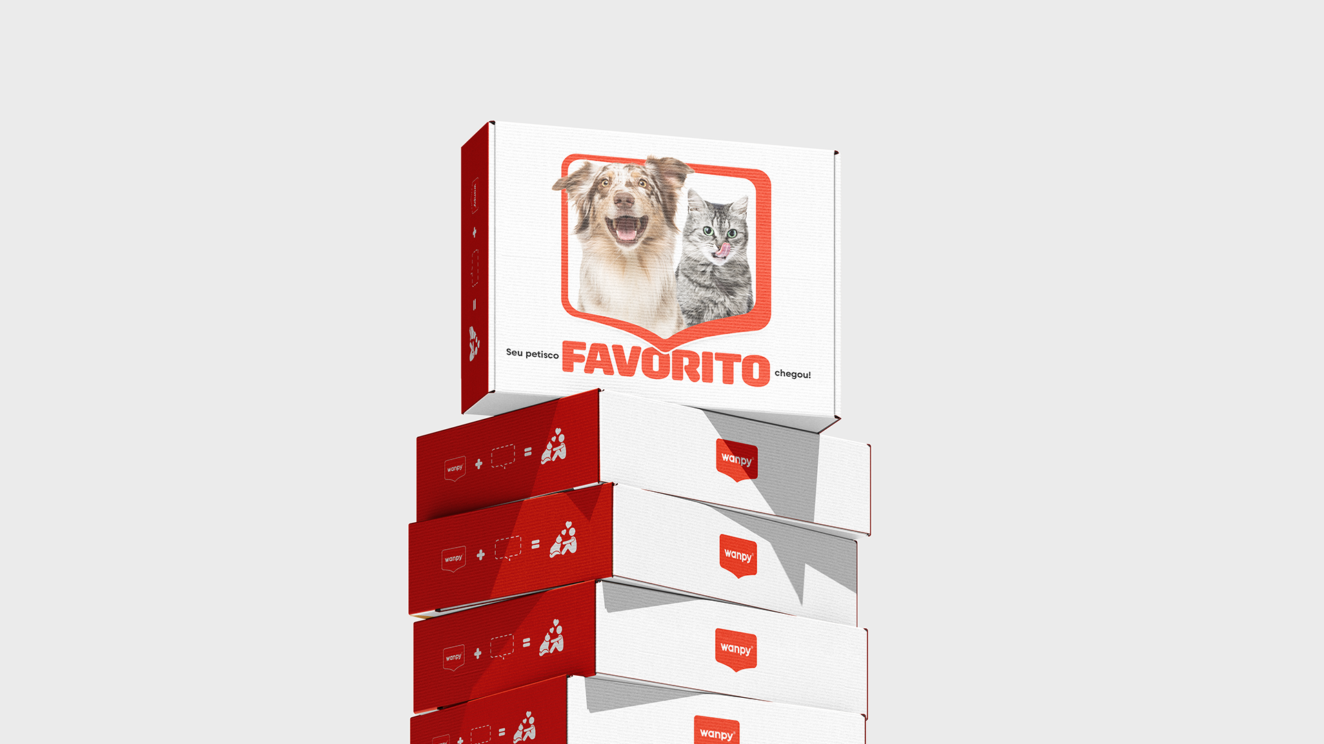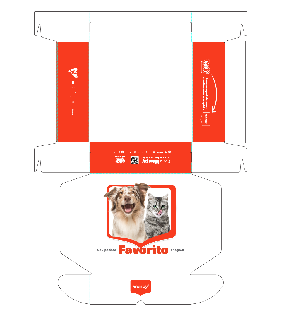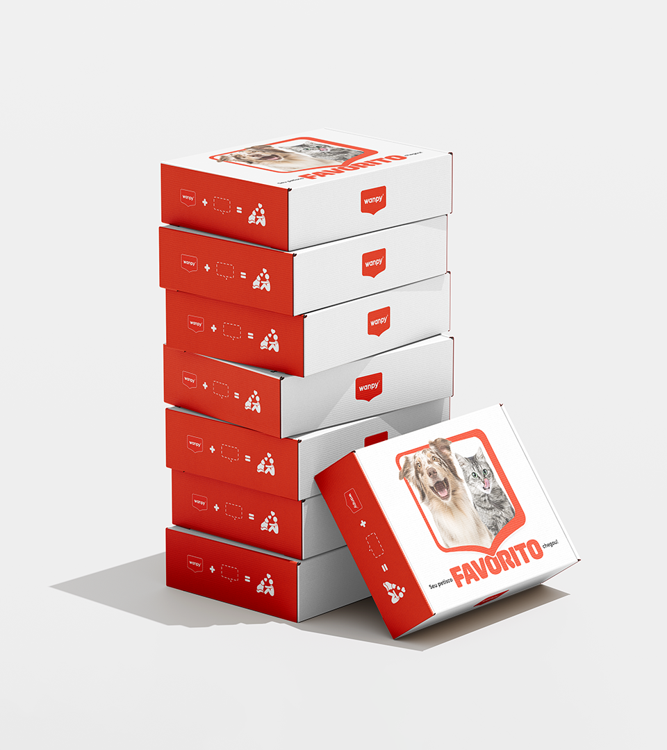 Feita com a cor principal da marca, a proposta foi trazer ênfase na caixa de diálogo como a própria vem reforçando: Uma conexão entre o tutor e seu pet. Os peludos são nossos melhores amigos, e a Wanpy deseja criar a ideia de que oferecer petiscos não é um simples ato de recompensa, mas sim um momento único de diálogo, amor e conexão.