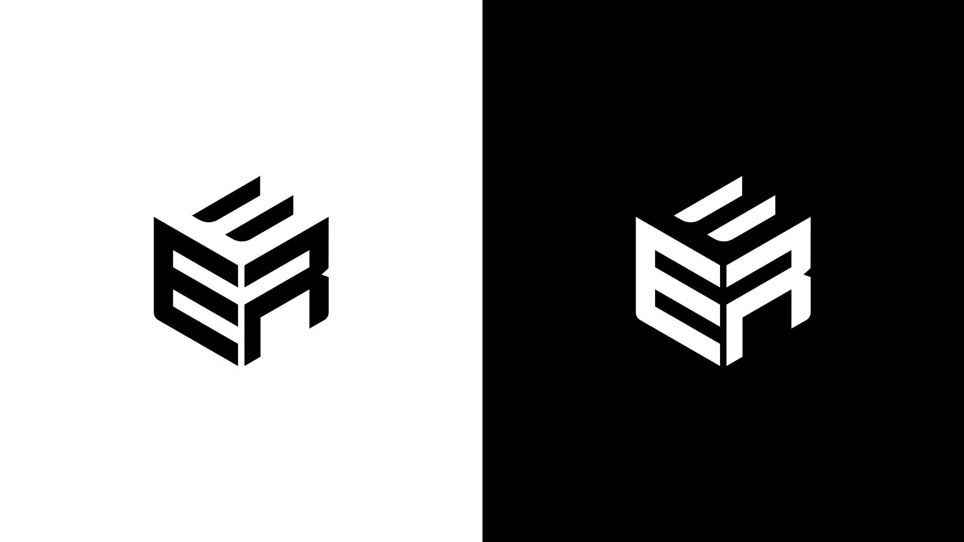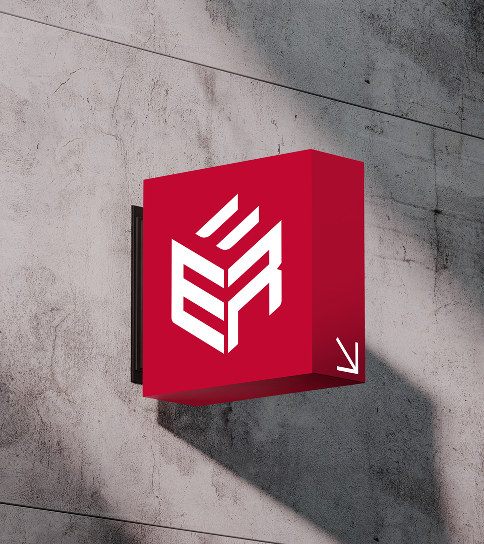 Portanto foram combinadas as letras E e R, iniciais do nome, em diferentes faces da caixa, entre positivo e negativo, a escolha pra comunicar de forma rápida as iniciais da empresa e delimitar sua atuação.