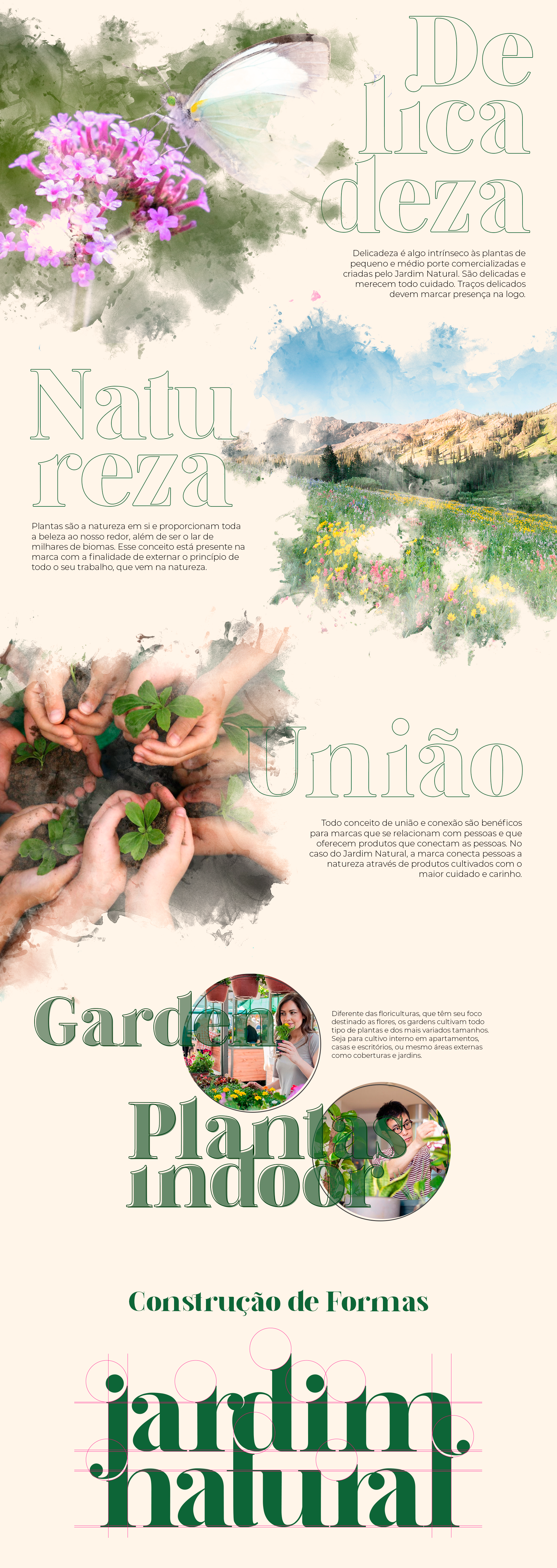 Assim, toda a tipografia foi desenhada de forma única, delicada, suave e toda unida. Elegemos a planta do momento, a mais desejada, fotografada e utilizada nos melhores ambientes da atualidade; dona de uma beleza única: a popular costela de adão, que representa toda a natureza e característica de trabalho do cliente - jardins internos e externos.